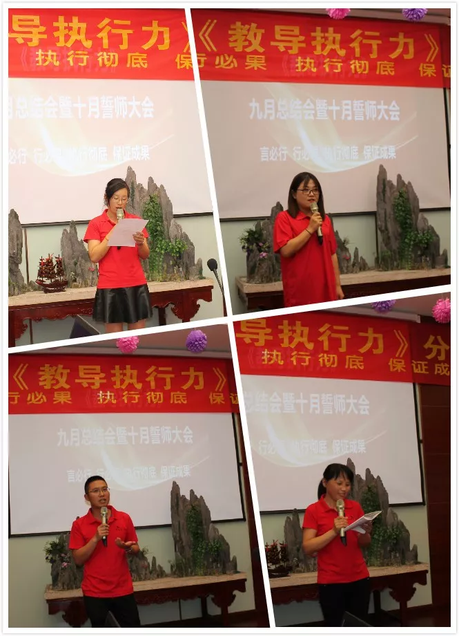 懲罰后的學(xué)員也分析了客觀(guān)與主觀(guān)原因,承諾會(huì )吸取教訓,總結經(jīng)驗,更好地投身到接下來(lái)的工作中,五位學(xué)員也現場(chǎng)宣讀了10月工作完成計劃承諾書(shū)。光芒、皓日等企業(yè)代表也分享了他們對于執行力的獨到見(jiàn)解,認為要想成功就必須要有目標,朝著(zhù)目標不斷前進(jìn);即使失敗了,也不逃避責任,不弄虛作假。精彩的交流分享會(huì )也讓在座的所有與會(huì )人員收獲頗多。