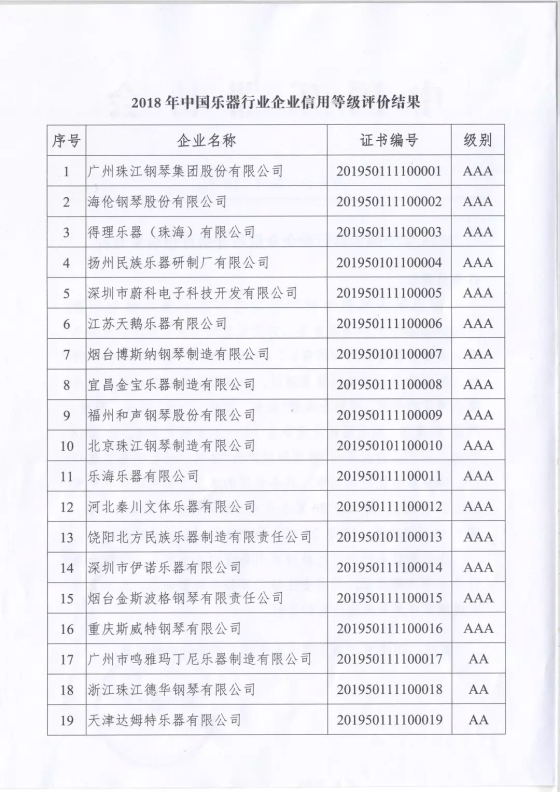 2018年中國樂(lè )器行業(yè)企業(yè)信用3A級企業(yè)