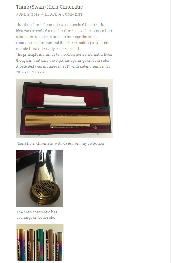 2017年天鵝推出了笛聲口琴,這個(gè)原理是將三個(gè)八度口琴嵌入到一個(gè)更大的金屬管中,以利用管道的內部共振,從而產(chǎn)生更圓潤和有內部回聲的聲音。原理類(lèi)似Koch horn chromatic。即使在這種情況下,管道兩邊都有開(kāi)口。這款笛聲口琴在2017年獲得實(shí)用新型專(zhuān)利,專(zhuān)利號為:ZL201720578099.2。