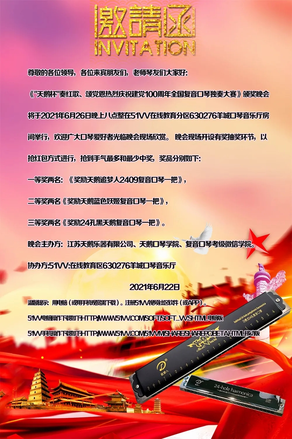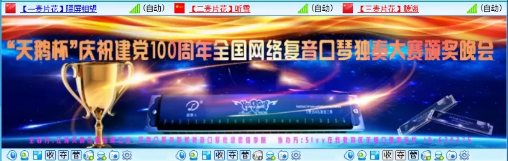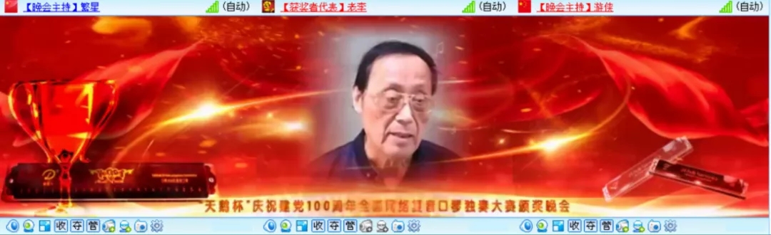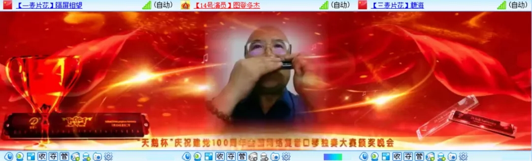 為熱烈慶祝建黨100周年,全國復音口琴獨奏大賽于2021年4月20日至6月30日在各口琴網(wǎng)絡(luò )群成功舉辦,歷時(shí)二個(gè)月時(shí)間,現已圓滿(mǎn)結束。6月26日晚八點(diǎn),“天鵝杯”慶祝建黨100周年全國網(wǎng)絡(luò )復音口琴獨奏大賽頒獎晚會(huì )在51VV視頻社區舉辦。